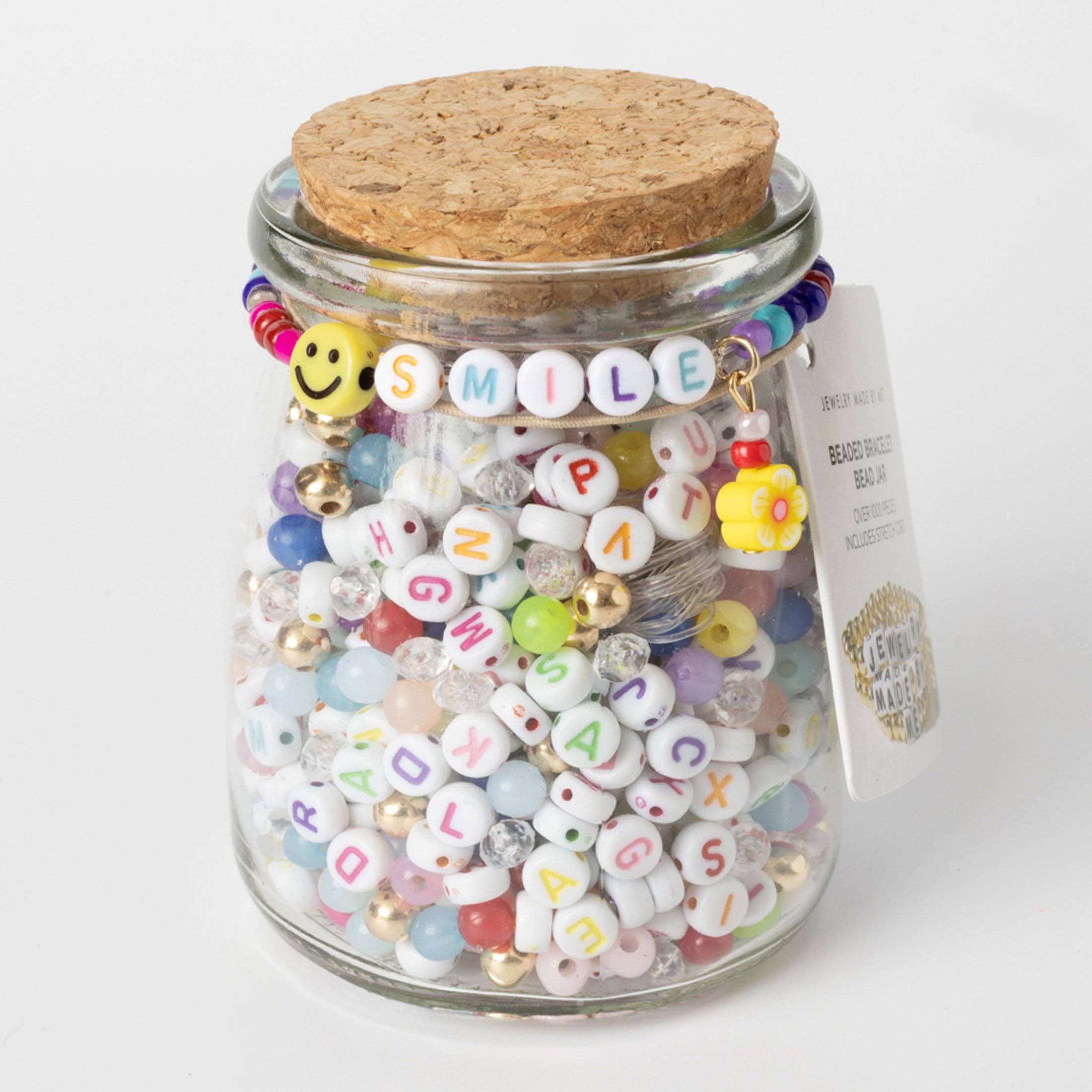 Make and trade friendship bracelets with the Original Bead Jarâ„¢. The Bright Smile stretch bracelet DIY bead kit includes over 1100 beads and 5 yards of stretch cord in an eco-conscious reusable glass jar with a cork lid. Makes 20 stretch bracelets!